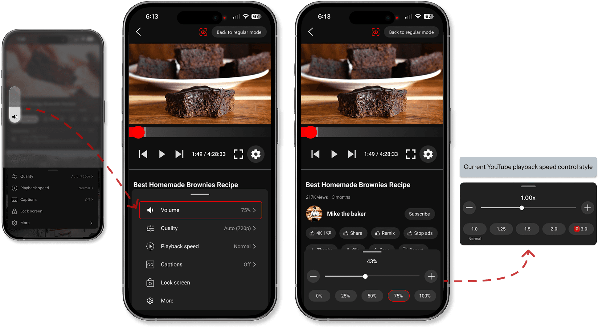 Instead of relying on the phone’s side buttons to adjust the volume, I added volume controls inside the playback settings. The interaction model follows familiar patterns like YouTube’s playback speed control. This design maintains a hands-free interaction experience while preserving brand consistency.