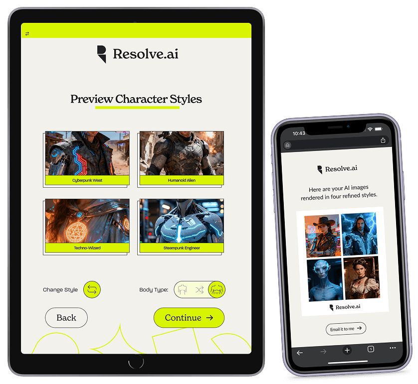 Designed and rebranded a Gen AI photobooth experience for Resolve AI, enabling users to capture selfies and generate AI stylized portraits in real time. I refined the touchscreen flow, defined AI image art direction, and collaborated with PMs and developers to deliver a seamless experience. Also contributed to booth visuals and marketing, creating a cohesive trade show presence.